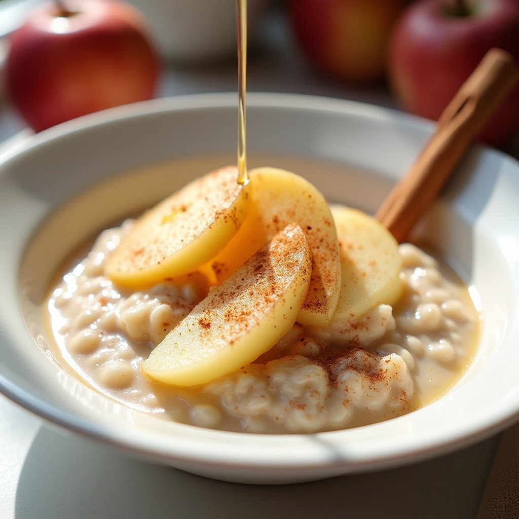 Freshly prepared, organic rolled oats cooked with chunks of fresh apple and cinnamon