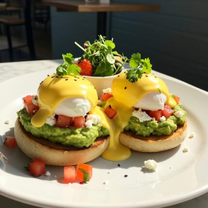 Avocado Toast Benedict – smashed avocado, pico de gallo, Feta