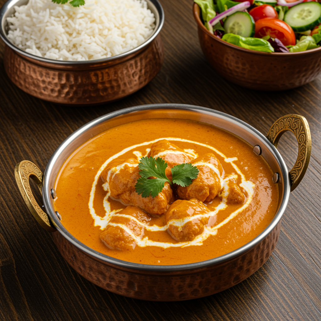 Butter Chicken with exotic spices served with bowl of rice & salad
